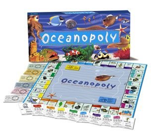 Theres something fishy about Ocean-Opoly Its all the fun of a large-scale aquarium without having to set it up or clean it This game features all kinds of ocean life with details about each one on the backs of the deeds Youll swim around the board as a crab fish shark fin lobster starfish Read More..
