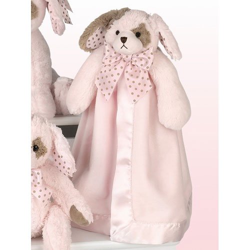 Match me with other Bearington Wiggles Baby Collection items Pink fuzzy puppy comes attached to snuggly 12 inch blanket Trimmed wbrown polka dotted ribbon Perfect security blanket for baby Style 196901 Read More..