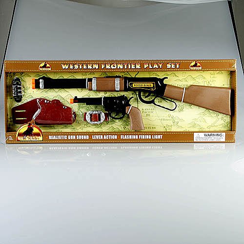 Western Frontier Rifle Pistol Playset This Western Frontier Rifle Playset is a great toy gun playset Features realistic gun sound lever action and flashing firing light Includes rifle pistol holster belt and bullets For ages 5 and up Read More..